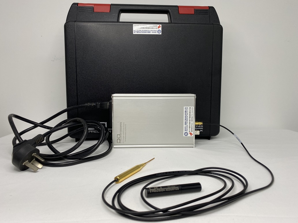 針式水聽器是把水下聲壓信號(hào)(水聽器針尖接收)轉(zhuǎn)換為電信號(hào)(在示波器端顯示)的換能器。當(dāng)壓電材料(PVDF)上的壓力(聲擾動(dòng))發(fā)生變化時(shí),壓電材料內(nèi)部的電荷分布就會(huì)成比例地發(fā)生變化并且會(huì)以電壓信號(hào)的形式體現(xiàn)出來(lái),因此可通過(guò)壓電元件表面上的電極提取這些電荷,經(jīng)前置放大器和DC耦合后,BNC接入示波器后,就可以出現(xiàn)電壓信號(hào)v(t)。經(jīng)過(guò)針式水聽器靈敏度??(?? ?????? )的換算,就可以得出換能器輸出的聲壓p(t),??(??) =??(??)/ ??(?? ?????? ).