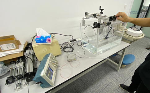 目前深圳一測醫(yī)療采用國際通用的水聽器方法,采用針式水聽器(NH1000或者NH0500)、超聲測試水箱(YICE0750)、示波器、BNC專用線纜進(jìn)行超聲聲工作頻率測試。將超聲理療設(shè)備換能器(注意防水)、針式水聽器(接收信號部分)置入超聲測試水箱兩端,點開超聲理療設(shè)備,即可在針式水聽器直流耦合末端通過BNC連接示波器,直接可以讀出超聲理療設(shè)備的實際聲工作頻率。