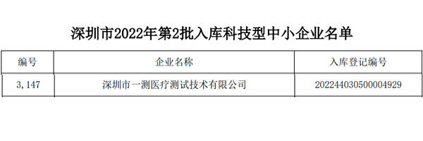根據(jù)《深圳市2022年第二批入庫科技型中小企業(yè)名單》顯示,我司“深圳市一測醫(yī)療測試技術(shù)有限公司”榮獲“科技型中小企業(yè)”稱號。具體公告內(nèi)容如下: