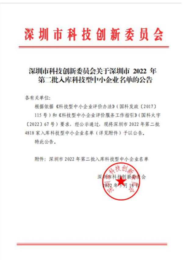 深圳市科技創(chuàng)新委員會關(guān)于深圳市 2022 年第二批入庫科技型中小企業(yè)名單的公告